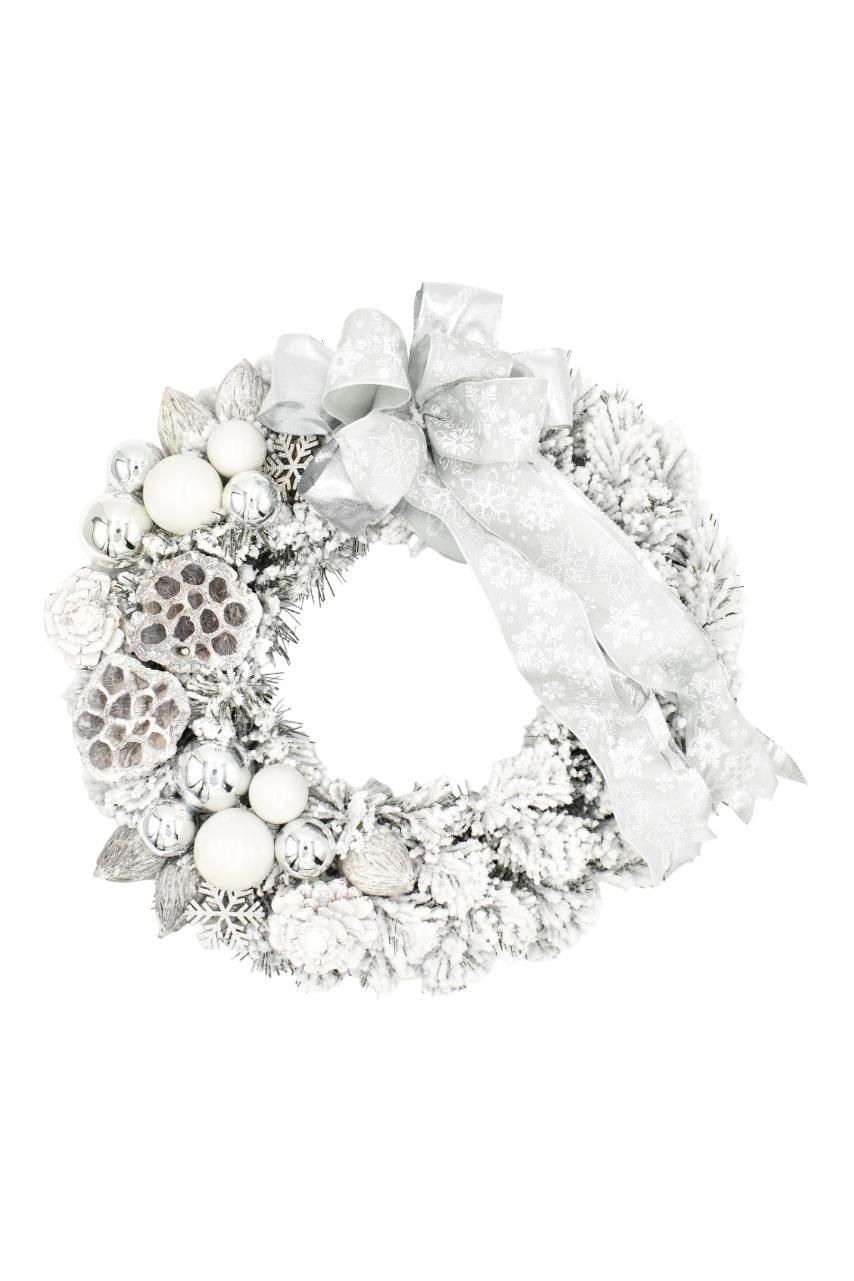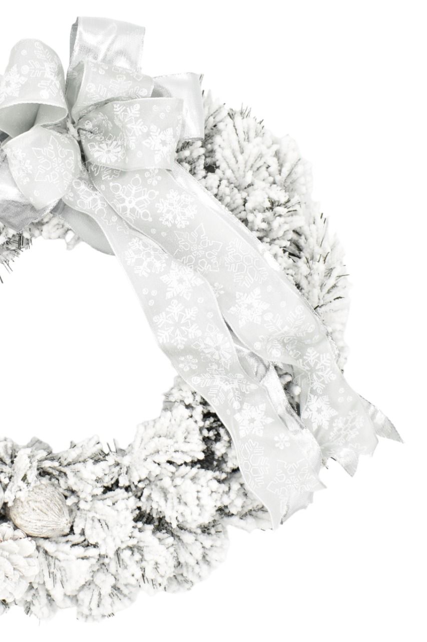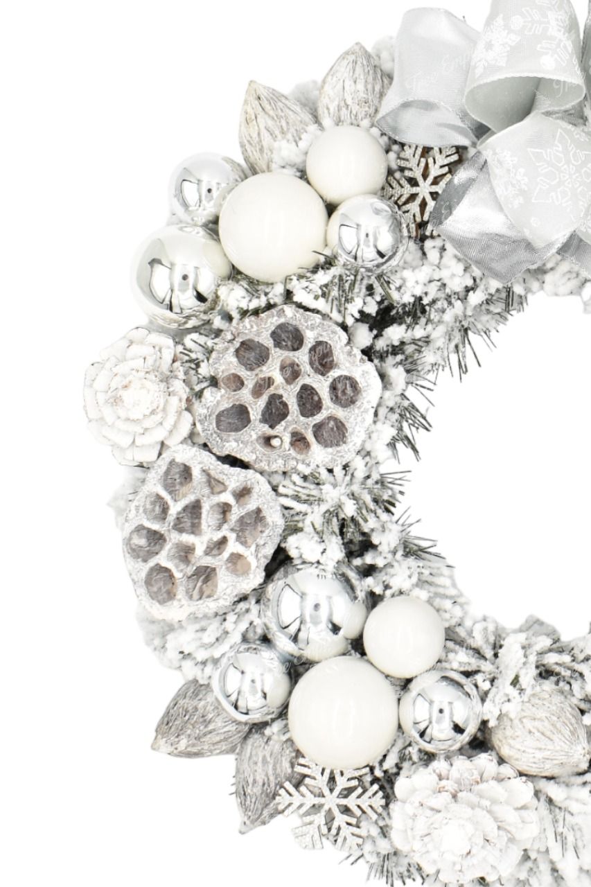 Snowy white decorating Christmas wreath with dense ply of fake snow will bring your Christmas decoration to perfection. This Christmas wreath possesses dense, flocked quality PVC needles. Complemented by elegant decorations in white-silver color and a massive ribbon. You can hang your Christmas wreath on the door or over the fireplace. After careful unfolding the wreath has a diameter of 35cm.